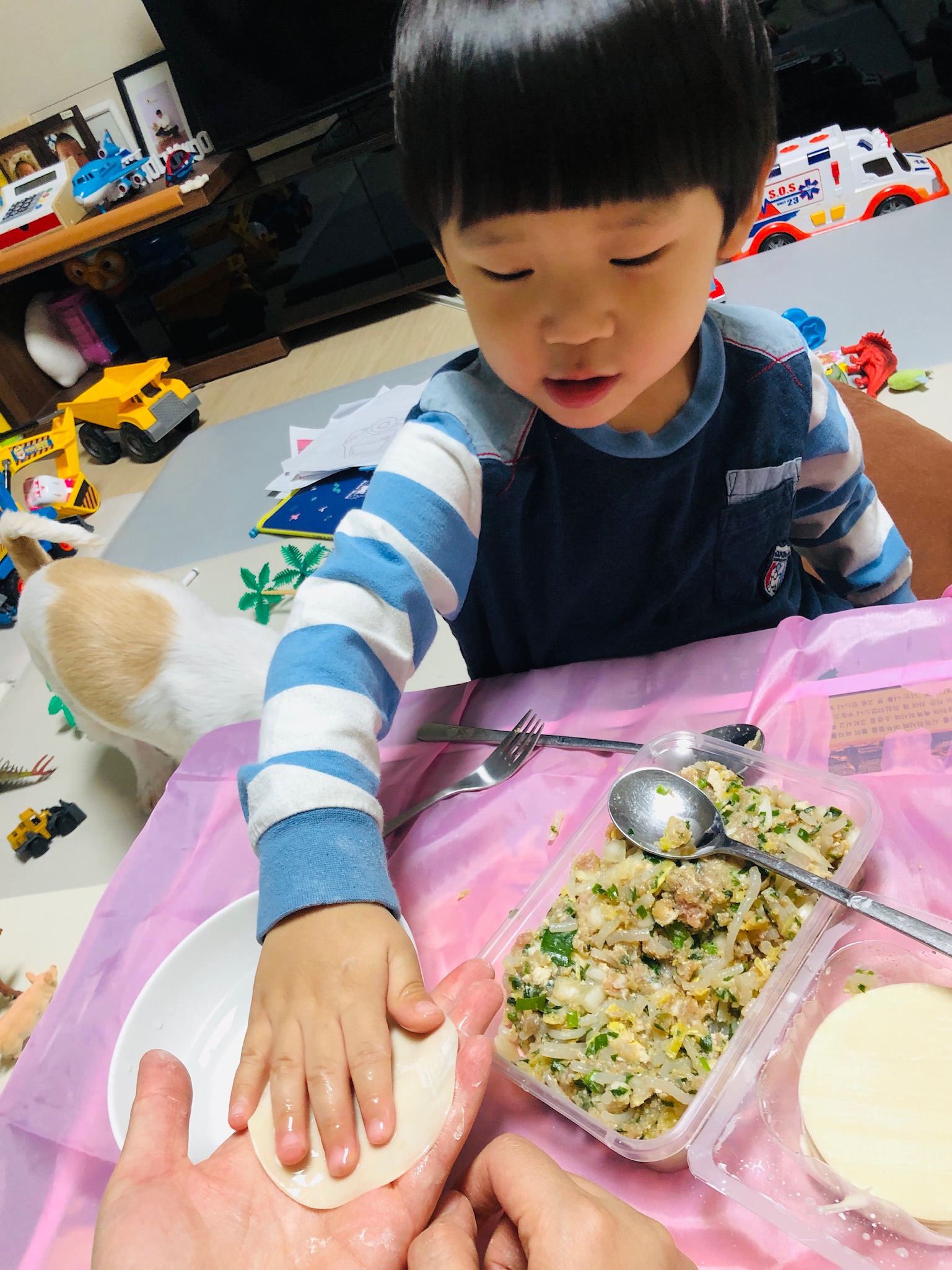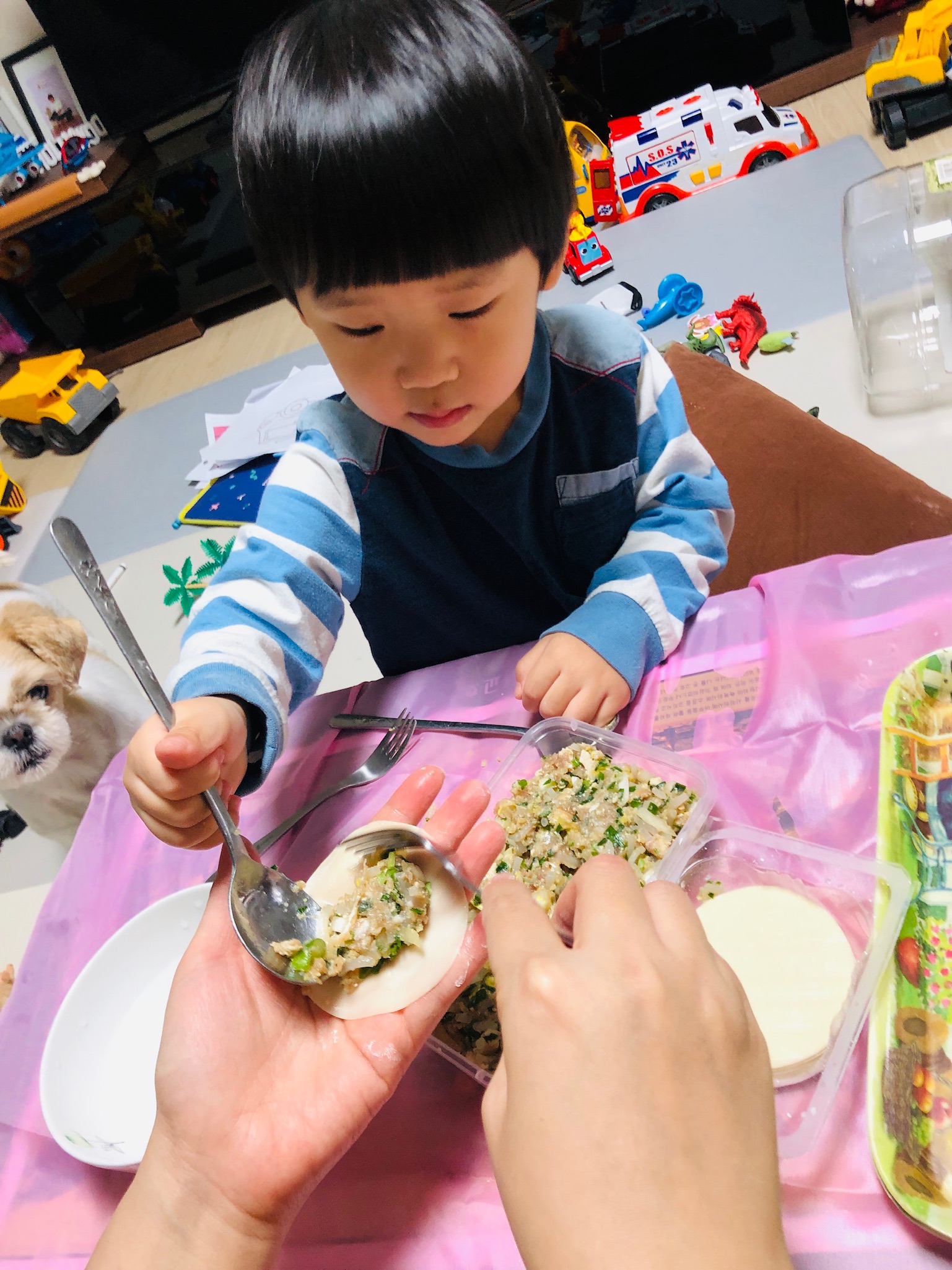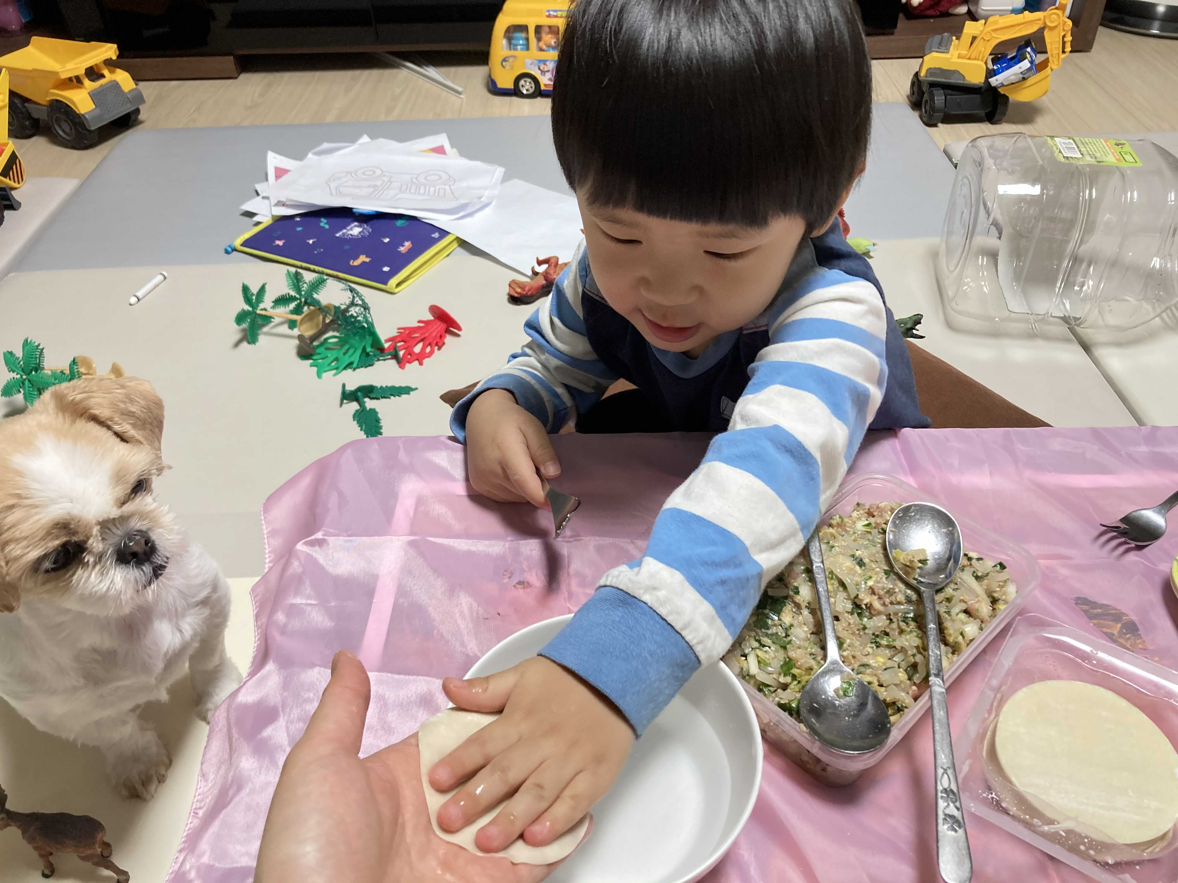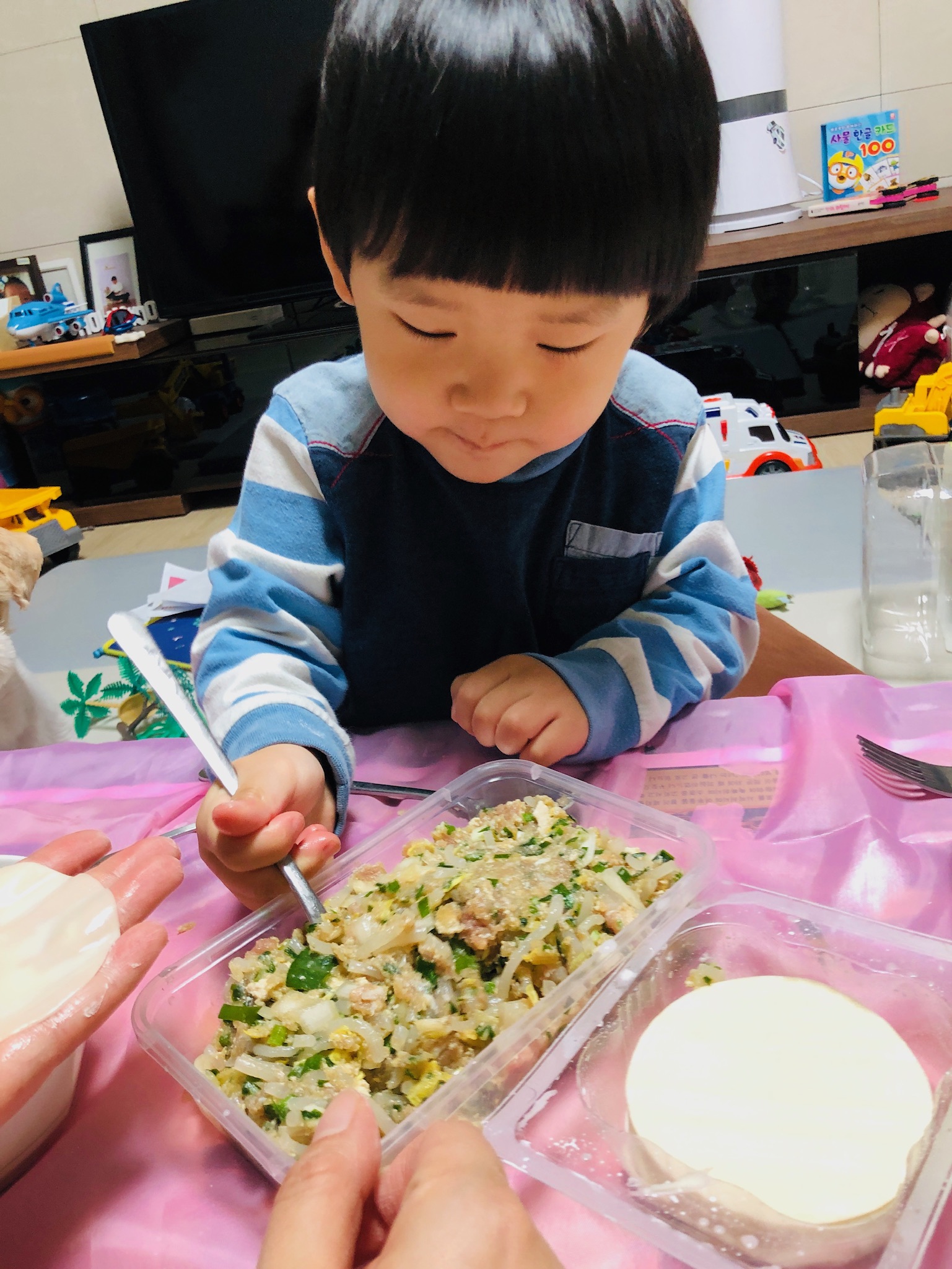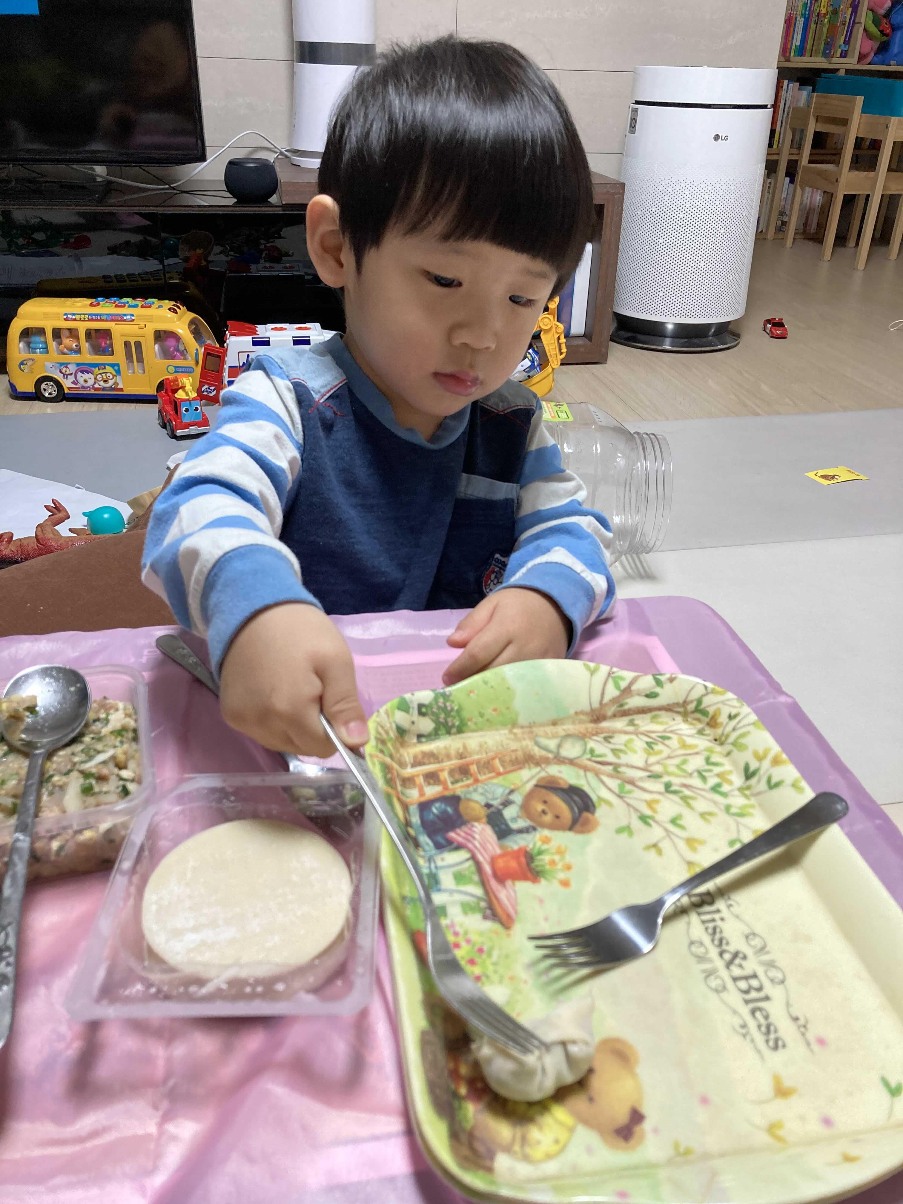 만둣속 넣는 것도 보여줬더니 나름 비슷하게 따라 하는 모습이었어요^^ 마지막엔 포크로 끝에만 콕콕 찍으라고 했더니 다 만든 만두를 콕! 찍어버렸어요ㅠㅠ