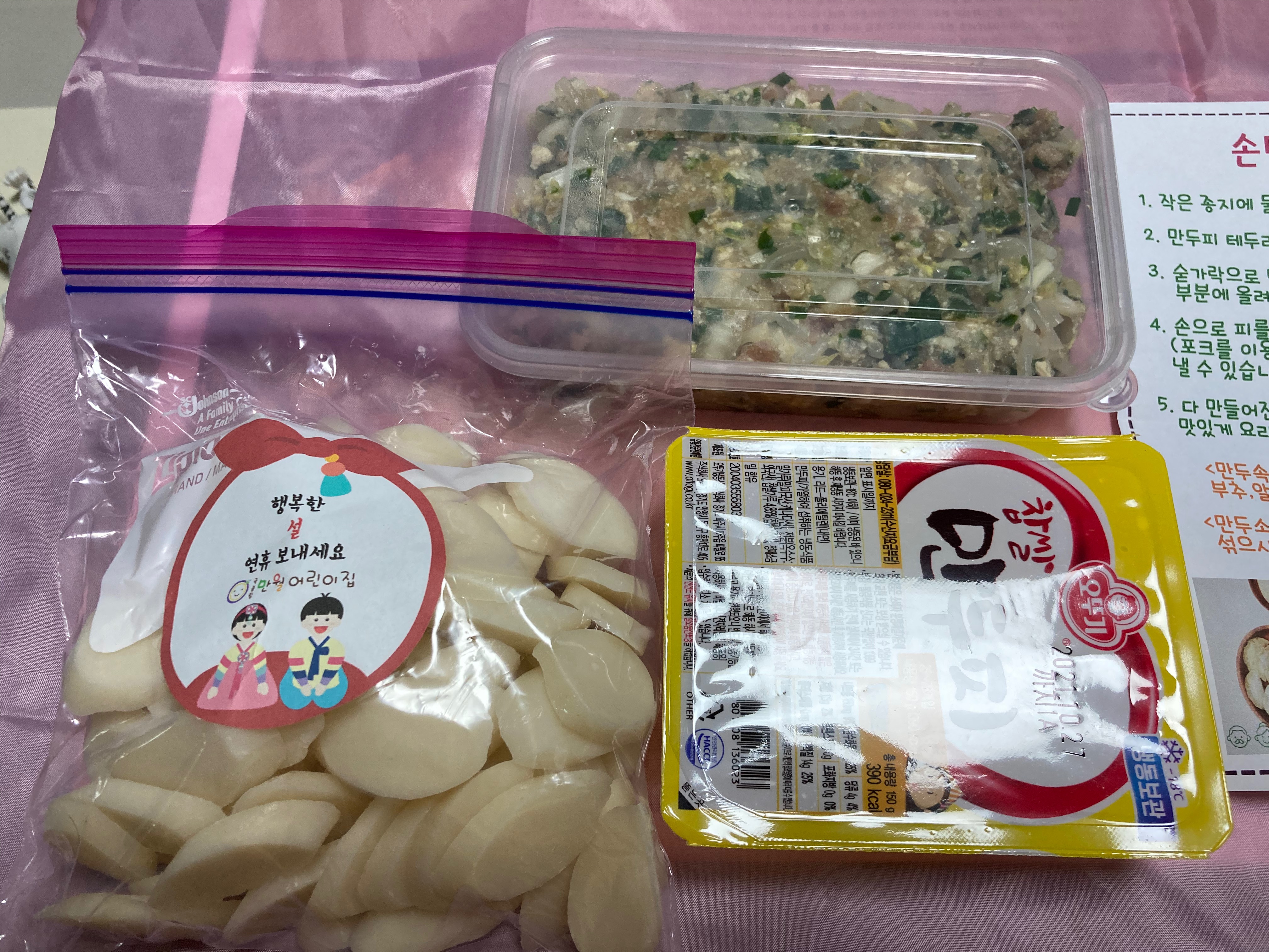 원래 어린이집에서는 명절행사를 했어야하는데 그렇지 못해 가족들끼리 만두 빚으며 즐거운 시간 보내시라고 만두 만들기 재료를 주셨더라구요.